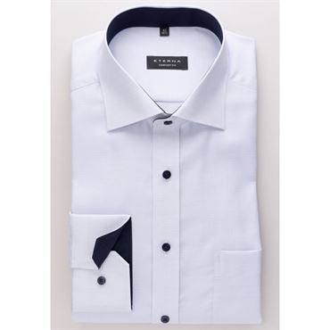 Eterna skjorte. Model: Blackline / comfort fit = Bred model med 1 brystlomme. Farve: Blå og hvid småternet, med kontrast i kraven og manchetterne. Kvalitet: 100% bomuld – NON IRON = STRYGEFRI Levering: 2-5 hverdage. Fineste Schweizer metervare. Producere